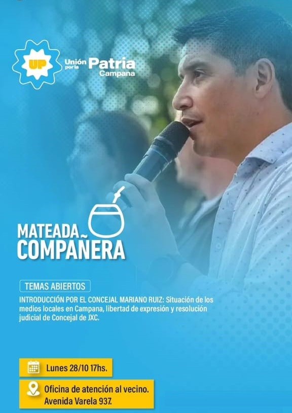 Unión por la Patria Campana invita a los vecinos a un encuentro con el concejal Mariano Ruiz para charlar y debatir sobre el periodismo y las noticias en la ciudad. Será el lunes a las 17 en la Oficina de atención al vecino del partido en Av. Varela 937. AUDIO: MARIANO RUIZ - concejal UxP/PJ