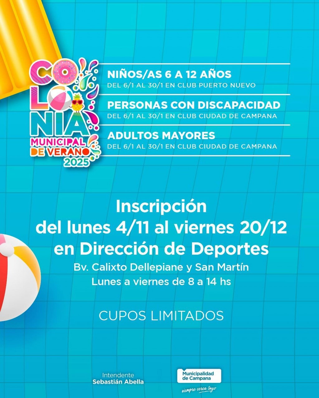 Comenzó la inscripción para la propuesta gratuita que está destinada a adultos mayores, jóvenes con discapacidad y niños de entre 6 y 12 años. Se desarrollará desde el lunes 6 al viernes 31 de enero. La inscripción se realiza en Calixto Dellepiane y San Martín, de lunes a viernes de 8 a 14, hasta el 20 de diciembre. AUDIO: MATÍAS LUGO - director de deportes