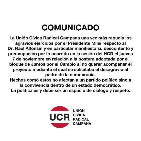 La Unión Cívica Radical repudió los agravios ejercidos por el presidente Javier Milei respecto al Dr. Raúl Alfonsín y en particular manifestaron el descontento y la preocupación por lo que ocurrió en la última sesión del HCD donde el bloque Juntos por el Cambio no acompañó el proyecto. AUDIO: KARINA SALA - Pte. UCR Campana