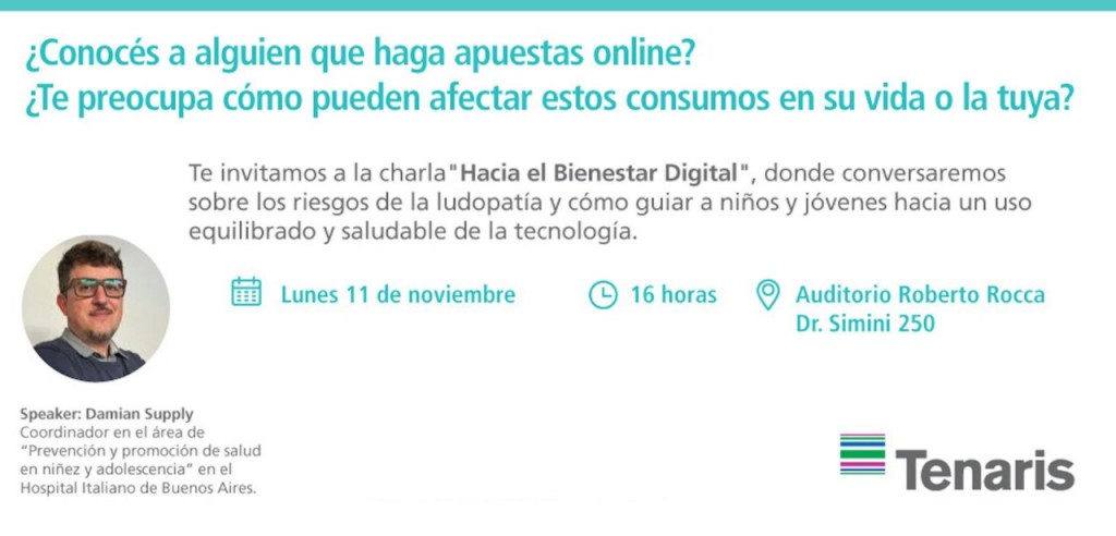 En el auditorio de Tenaris se desarrolló una nueva charla abierta a la comunidad. Estuvo a cargo del lic. Damián Supply. Tuvo como objetivo conocer los riesgos de la ludopatía y el uso equilibrado y saludable de la tecnología. AUDIO: DAMIÁN SUPPLY - psicólogo // YANINA LIVA - Beneficios y experiencia de empleados en Tenaris