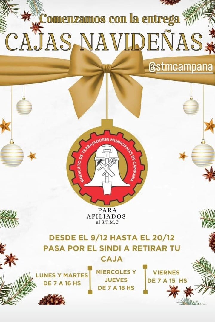 A partir del lunes 9 los afiliados al Sindicato de Trabajadores Municipales de Campana podrán pasar a retirar su obsequio para Navidad. Se entregarán en la sede del sindicato el lunes y martes de 7 a 16, miércoles y jueves de 7 a 18 y los viernes de 7 a 15. AUDIO: WALTER OTAMENDI - sec. de prensa del sindicato municipal