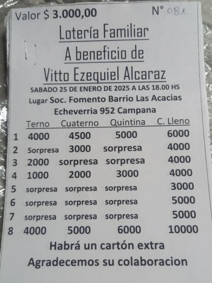 Vitto Alcaraz es un niño de nuestra ciudad que está luchando contra la leucemia. El pequeño de tan solo 5 años precisa de la solidaridad de la comunidad. El sábado 25 de enero a las 18 se realizará una lotería familiar en la Sociedad de Fomento del Barrio Las Acacias. AUDIO: LORENA ORTIZ - mamá de Vitto
