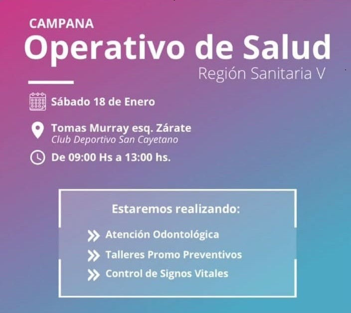 Lo llevará a cabo el Gobierno de la Provincia de Buenos Aires, a través de la Región Sanitaria V. Se desarrollará mañana de 9 a 13 en el Club Deportivo San Cayetano. Entre las actividades programadas se incluyen: atención odontológica; talleres de prevención y control de signos vitales. AUDIO: ALEJO SARNA - concejal UxP