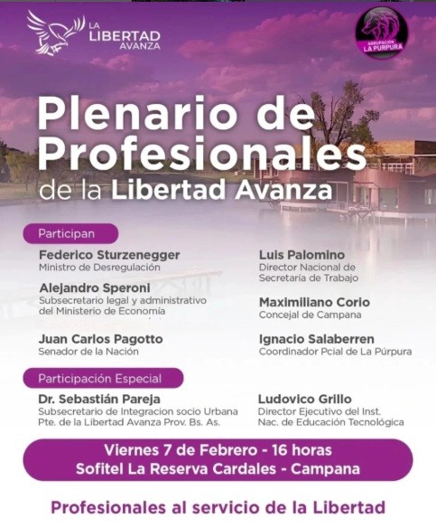 Serán dos encuentros, de profesionales y de desregulación, organizados por La Libertad Avanza para el próximo 7 de febrero en el Hotel Sofitel. La actividad comenzará a las 16 y será con inscripción previa. El orador principal será Federico Sturzenegger. AUDIO: MAXIMILIANO CORIO - concejal LLA