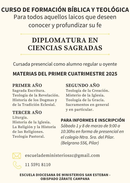 La Escuela Diocesana de Ministerios San Esteban, perteneciente al Obispado de Zárate-Campana abrió su inscripción para todos aquellos laicos que deseen conocer y profundizar su fe. El sábado 1 de marzo se realizará la charla informativa acerca de la Diplomatura en Ciencias Sagradas. AUDIO: DANIEL TORINO - Secretario Académico de la Escuela de ministerios