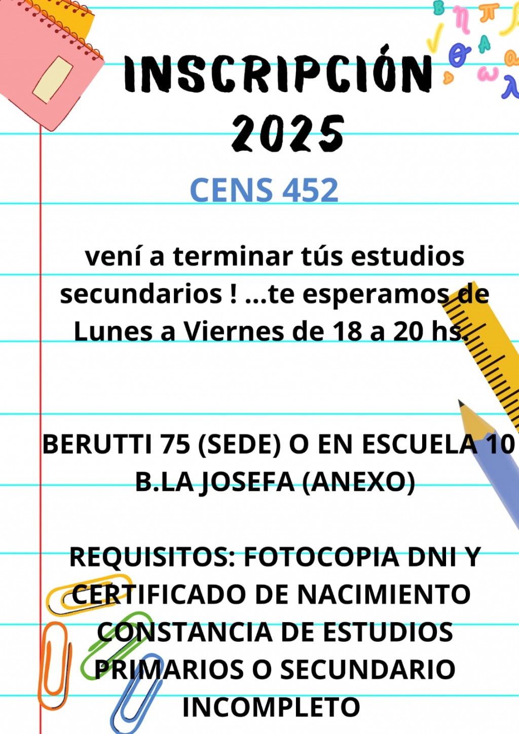 Está abierta la inscripción para quienes quieran terminar sus estudios secundarios en el CENS 452. Pueden hacerlo en la sede de Berutti 75, donde funciona la Escuela 9, o en la Escuela 10 del Barrio La Josefa. El horario para acercarse es de lunes a viernes de 18 a 20. AUDIO: HUMBERTO LIMA - director CENS 452