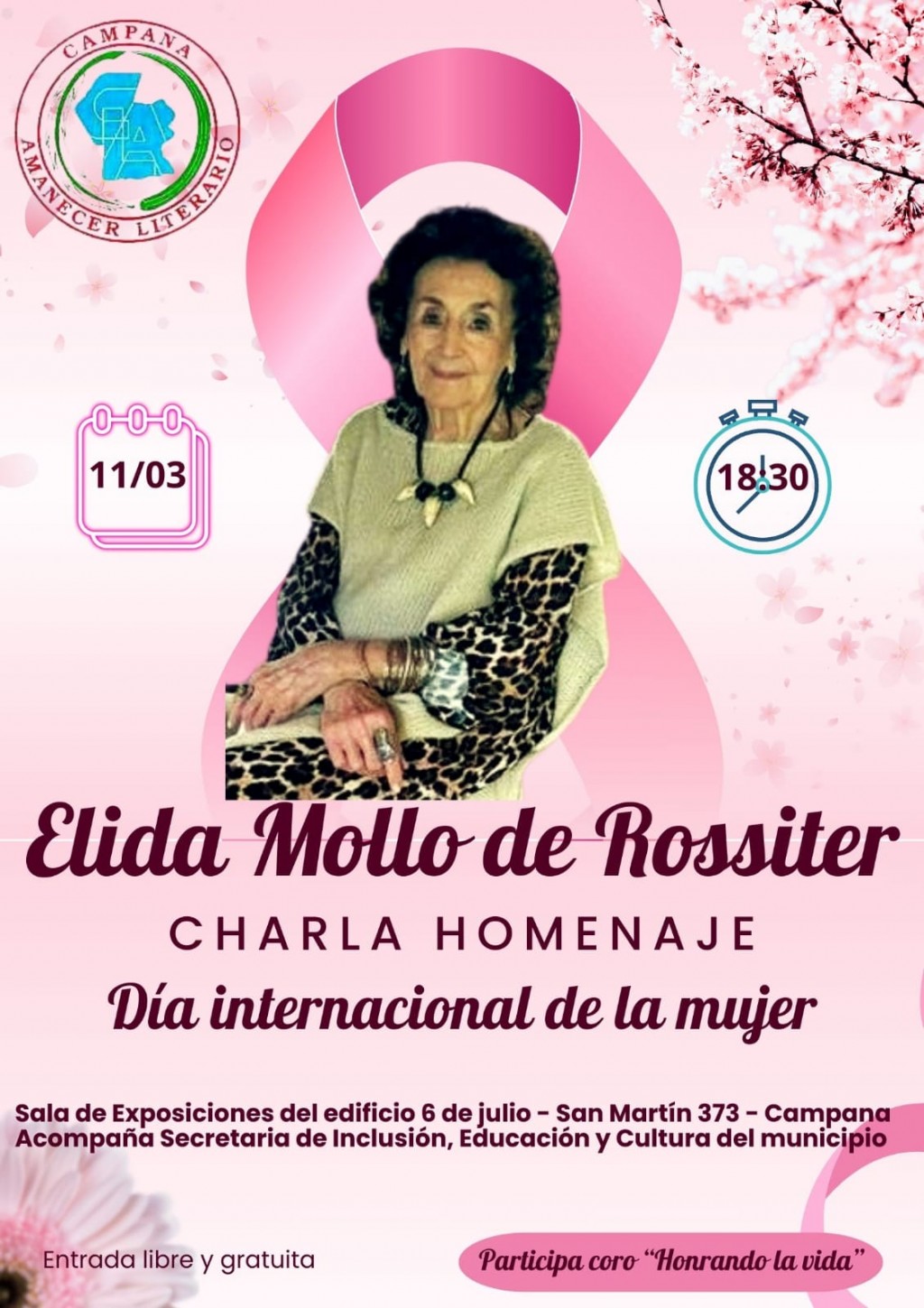 Desde Campana Amanecer Literario invitan a la charla homenaje a Elisa Mollo de Rossiter. Se realizará el martes 11 de marzo a las 18:30 en el salón de exposiciones del Edificio 6 de julio, San Martín 373. La entrada es libre y gratuita. AUDIO: STELLA MARIS GONZÁLEZ CHUQUEL - Pte. CAL
