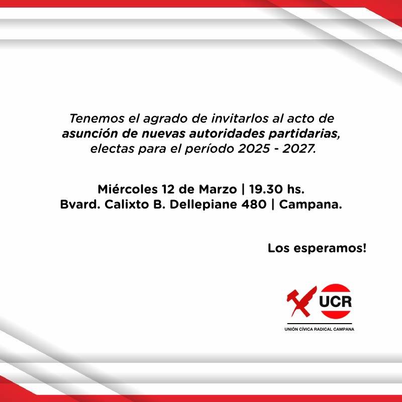 Mañana a las 19:30 se realizará el acto de asunción de las nuevas autoridades partidarias de la Unión Cívica Radical Campana en la sede ubicada en Bv. Calixto Dellepiane 480. La nueva Comisión Directiva asumirá formalmente sus funciones por un periodo de 2 años. AUDIO: MARTÍN MUNITICH - Pte. electo UCR Campana