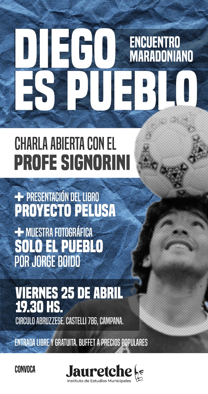 El Instituto Jauretche organiza una charla abierta con el Profesor Signorini el viernes 25 de abril a las 19:30 en el Círculo Abruzzese. Titulada “Diego es pueblo, encuentro maradoniano” se presentará el libro “Proyecto pelusa” y habrá una muestra fotográfica. AUDIO: GERMÁN JENDRULEK - Instituto Jauretche