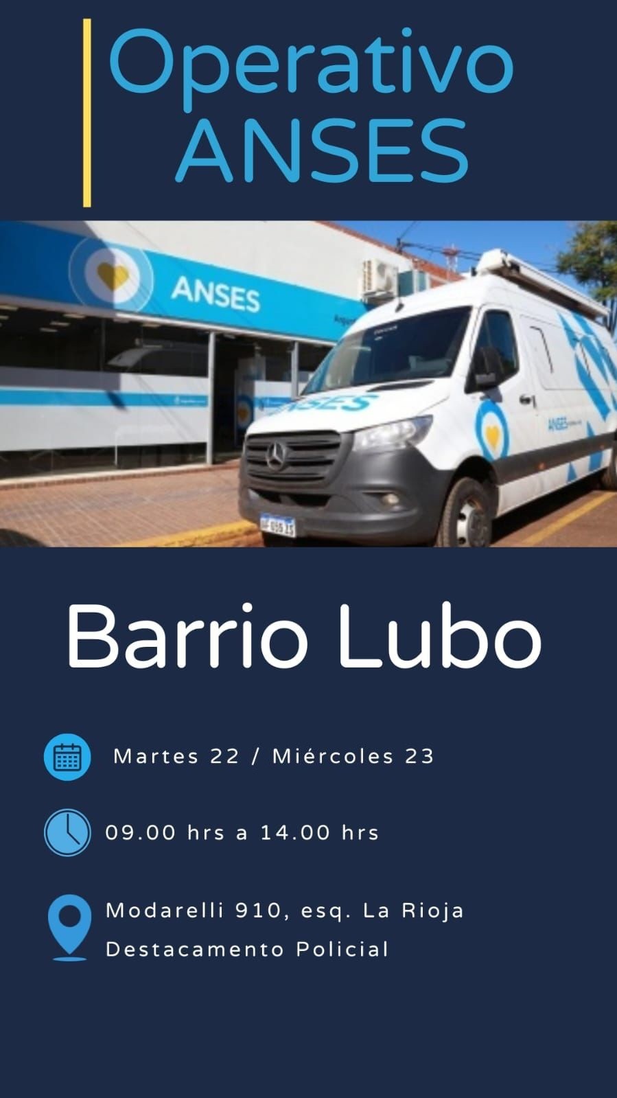 La Oficina de Anses visitará Barrio Lubo mañana y el miércoles de 9 a 14. La camioneta estará ubicada al lado del destacamento Policial, Modarelli 910. AUDIO: MAXIMILIANO CORIO - concejal LLA
