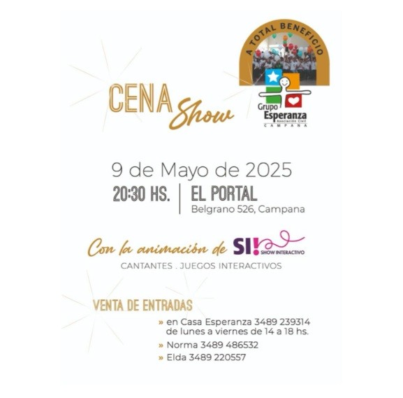 El Grupo Esperanza organizó para este próximo viernes desde las 20:30 su cena de gala. Será en el salón El Portal y contará con un show interactivo, cantantes y juegos. AUDIO: ELDA BOCCA - Grupo Esperanza