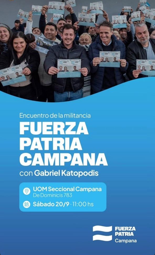 En el marco de un encuentro con la militancia del espacio Fuerza Patria estará mañana en nuestra ciudad Gabriel Katopodis. Será en la sede la UOM, De Dominicis 783 a las 11. AUDIO: ALEJO SARNA - concejal