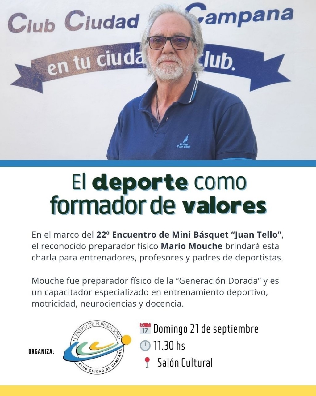 El reconocido profesor y entrenador Mario Mouche brindará una charla este domingo a las 11.30 en el CCC. Será abierta a la comunidad, en el marco del Encuentro de Mini Básquet "Juan Tello". ADRIÁN RAFAEL - Coordinador deportivo CCC