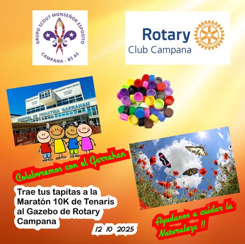Rotary Club Campana el Grupo Scouts Monseñor Espósito desarrollarán una campaña para concientizar sobre la preservación del Medio Ambiente y ayudar a la Fundación Garrahan. El 12 de octubre en la carreara 10K de Tenaris comenzarán a recolectar tapitas de plástico. AUDIO: WALTER WAISMAN – fundación Rotary Campana