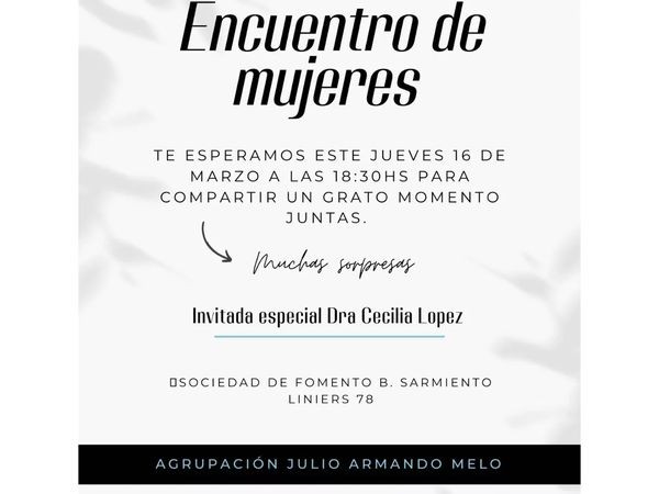 La Agrupación Julio Armando Melo organizó distintos encuentros con mujeres en el marco del mes de la mujer. El primero se realizará hoy en la Sociedad de Fomento de Barrio Sarmiento, Liniers 78. Será una charla a cargo de la doctora Cecilia López en la que se abordarán temas vinculados a la salud y el rol que ocupan las mujeres en la actualidad. AUDIO: JAVIER CONTRERAS - Agrupación Melo