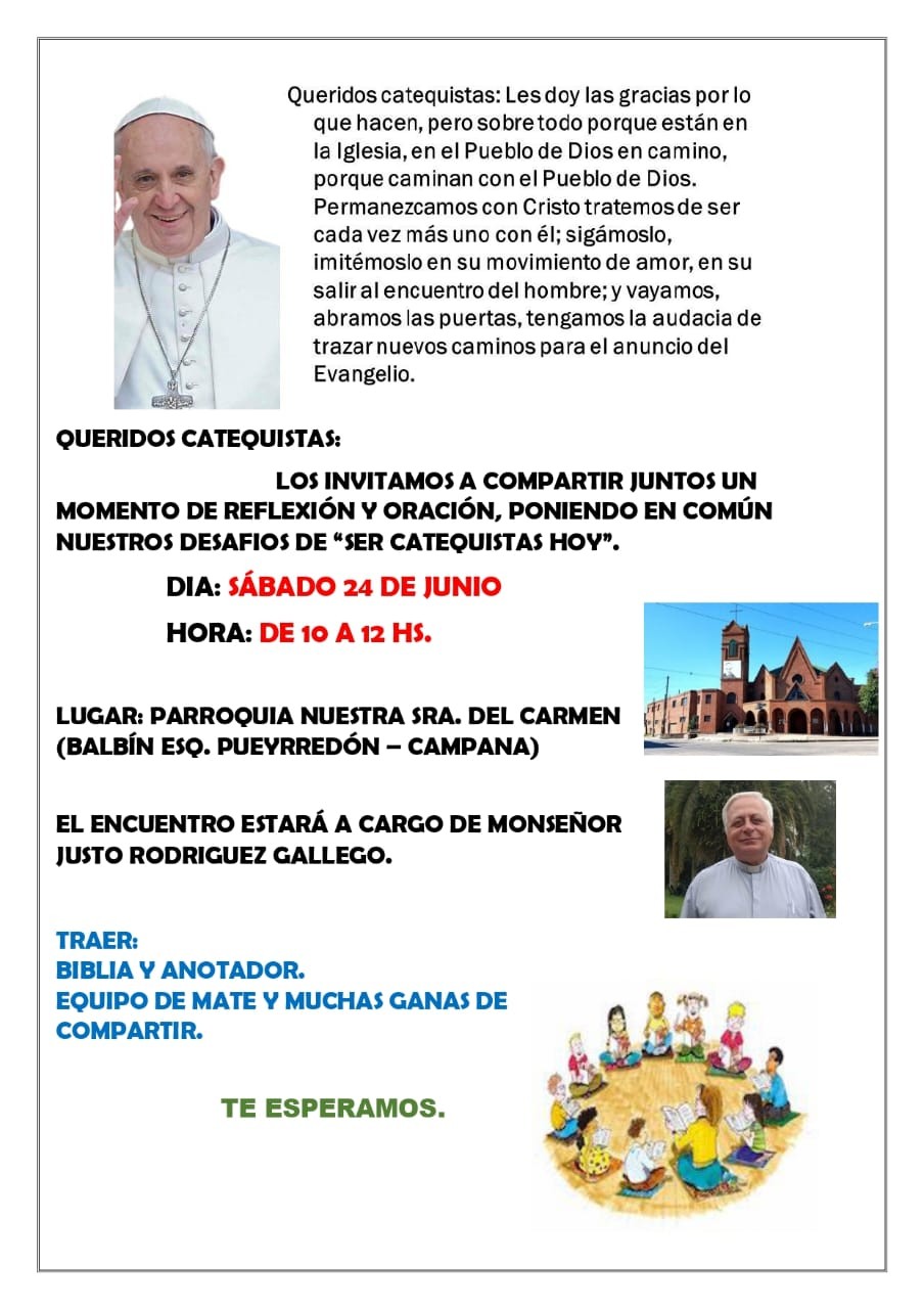 Será el sábado 24 en la Parroquia Nuestra Señora del Carmen de 10 a 12 y estará a cargo del Obispo Auxilia Mons. Justo Rodríguez Gallego. Será una jornada de reflexión, oración y una puesta en común de los desafíos de “ser catequista hoy”. AUDIO: Pdre. FERNANDO CREVATÍN - Párroco Catedral