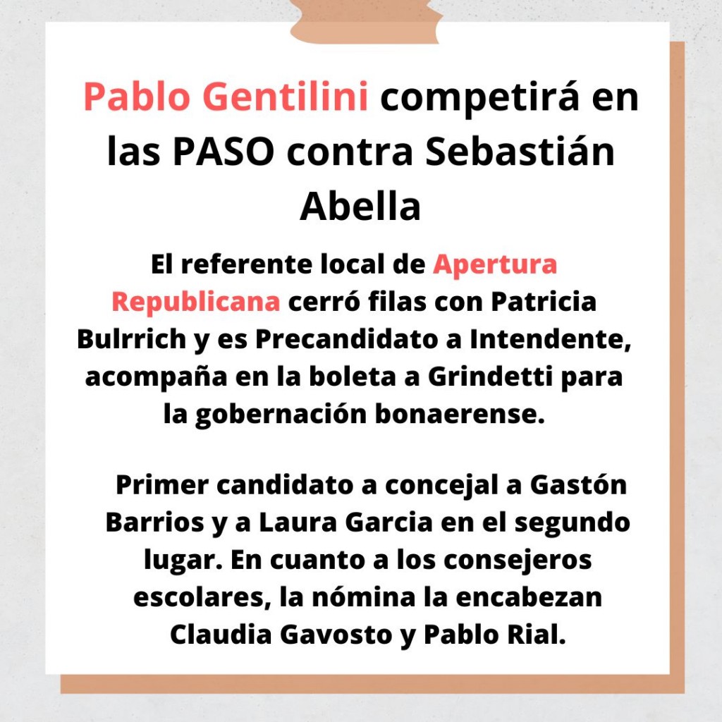 Pablo Gentilini será precandidato a intendente en las PASO de Juntos por el Cambio acompañando la precandidatura de Patricia Bullrich a presidente. La lista tendrá como primer precandidato a concejal a Gastón Barrios y a Laura García en el segundo lugar. AUDIO: PABLO GENTILINI - precandidato a intendente