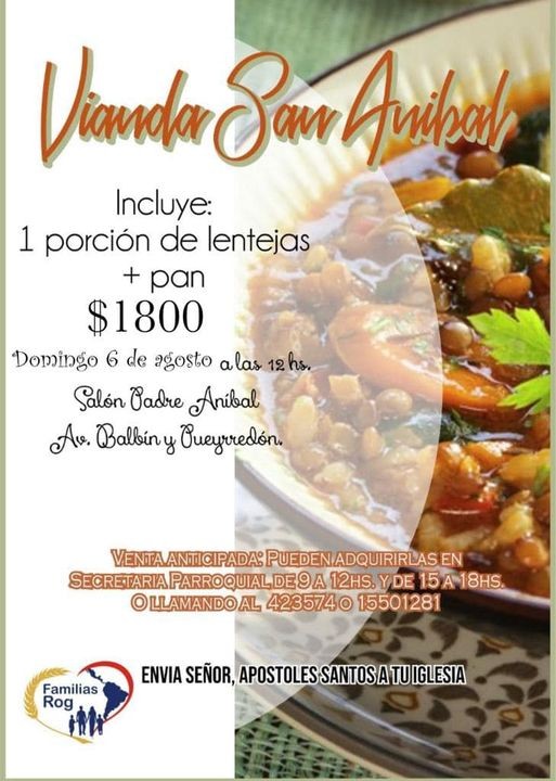 Las Familias Rog de la Parroquia del Carmen organizan una nueva venta de las Viandas de San Aníbal. Se entregarán el próximo domingo en el Salón Padre Aníbal. Quienes deseen reservar su porción pueden hacerlo al teléfono de la secretaría parroquial 423574. AUDIO: ANDREA GIOBELLINI - Familias Rog