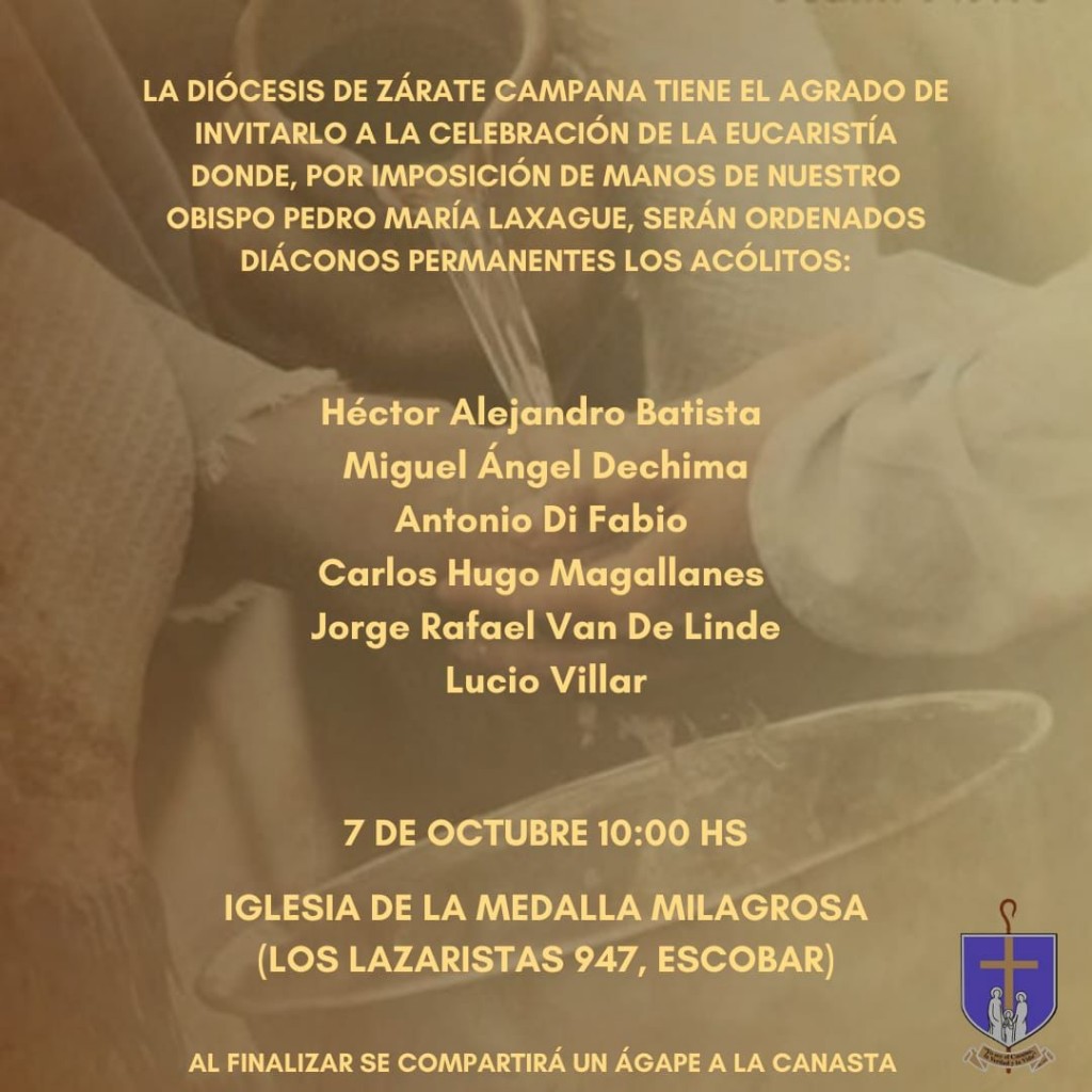 La Diócesis de Zárate-Campana invita a la comunidad a la celebración de la Eucaristía donde por imposición de manos de nuestro Obispo Pedro María Laxague serán ordenados 6 nuevos Diáconos permanentes. Será este sábado a las 10 en la Iglesia de la Medalla Milagrosa de Escobar. AUDIO: MONS. JUSTO RODRÍGUEZ GALLEGO - Obispo auxiliar Zte-Cpna
